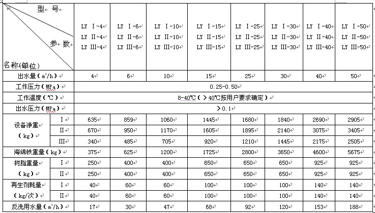 注:1、LY Ⅰ型將海綿鐵和交換樹脂裝于同一設備的上下兩個隔離室中,適用于蒸汽鍋爐;