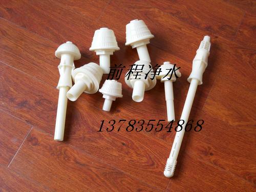 反沖洗濾帽;濾頭是濾池底部配水系統汽水反沖冼裝置,它能有效地沖洗出濾池中的污泥雜物,保證濾池水質水量正常運行;濾頭的種類有(長、短柄)磨菇型、梅花型、塔型和圓柱型,均采用ABS工程塑料制成,結構合理,連接牢固,承壓強度高,縫隙不變型,能使濾板間無死水角區,不積泥,效果好。長柄濾頭常用于濾池汽水反沖洗配水系統;短柄濾頭應用于單水反沖洗和重力式,壓力式濾罐及離子交換濾床等水處理設備的過濾裝置。濾頭濾帽用于城市飲用水,工業用水凈化,濾頭濾帽是高純水,礦泉水經營中的凈化材料,濾頭濾帽有效脫除水中的COD,色素,臭氣毒害物質。