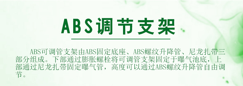 ABS調節支架由ABS固定底座、ABS螺紋升降管、尼龍扎帶三部分組成。下部通過膨脹螺栓將可調管支架固定于曝氣池底,上部通過尼龍扎帶固定曝氣管,高度可以通過ABS螺紋升降管自由調節。